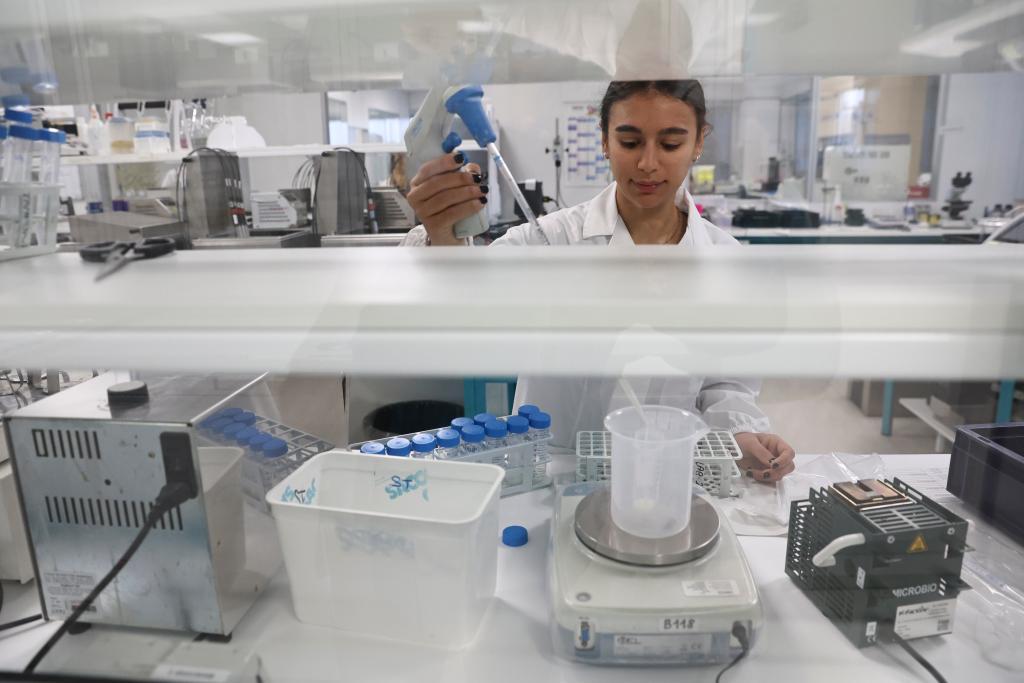 2025年10月31日,在意大利萨龙诺,生物科技企业萨科集团(Sacco System)的工作人员在实验室工作。新华社记者李京摄