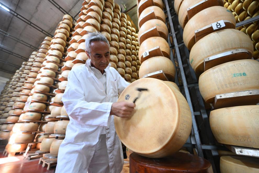 2025年7月17日,工作人员在意大利帕尔马附近的一座奶酪工厂检查帕马森奶酪的品质。新华社发(阿尔贝托·林格里亚摄)