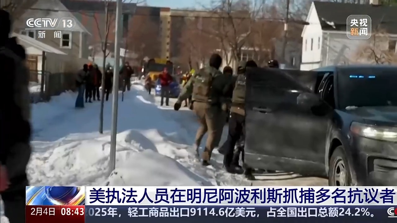 当地时间3日,美国移民与海关执法局人员在明尼苏达州最大城市明尼阿波利斯市的执法行动中,抓捕了多名抗议人士。现场画面显示,多名执法人员持胡椒喷雾与抗议人群对峙,并高声警告“退后”,还有抗议者被多名执法人员按倒在地,随后被铐上手铐。目前移民与海关执法局尚未就此事件作出回应。