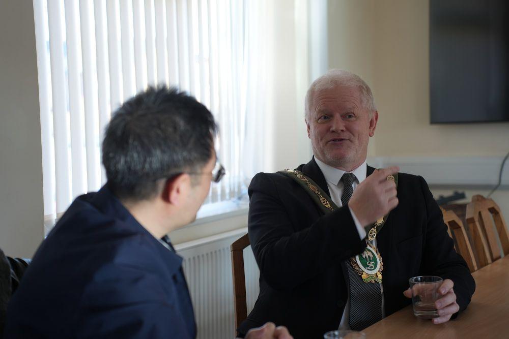 推门而入,镇长已等候多时。他身穿传统的镇长礼服,显得颇为隆重,脖子上挂着象征身份的金属链牌,徽章中央是一只羊——这是希普斯顿作为昔日羊屯的传统标志。他引领我们前往二楼的会议室,木质长桌一字排开,中央放着一只小巧的木质法槌。他说那是他主持会议时维持秩序的工具。