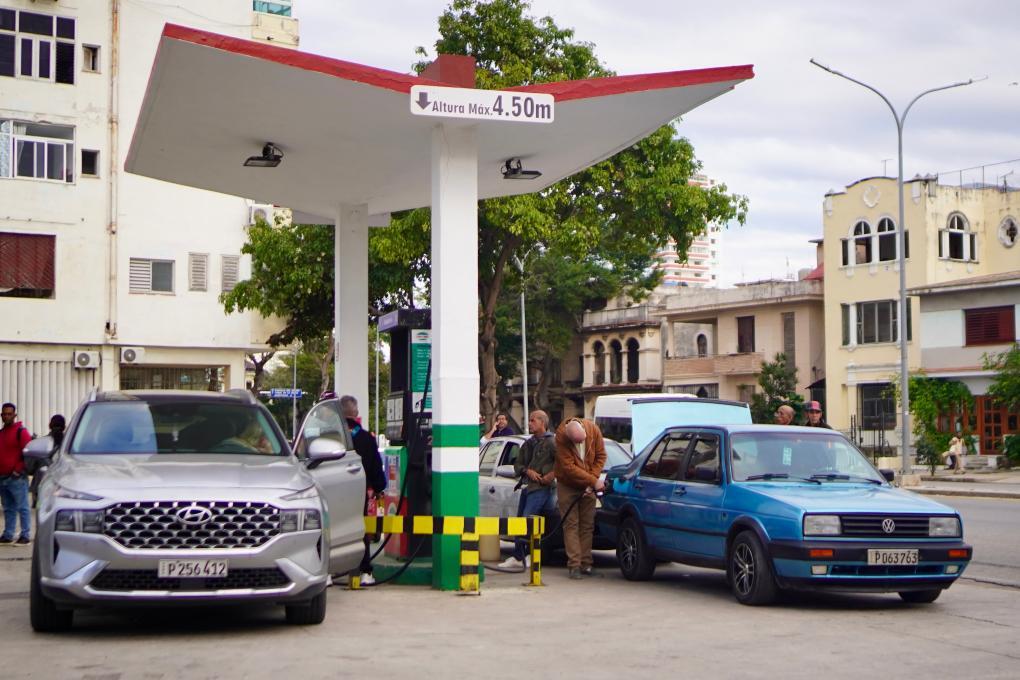 1月30日,在古巴首都哈瓦那,车辆在一处加油站加油。新华社记者蒋彪摄