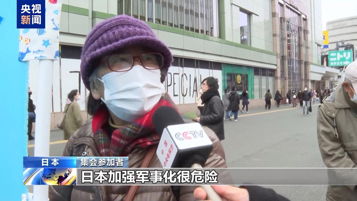 集会参加者:日本加强军事化很危险,战争已经结束几十年了,但对过去战争的反省和清算至今都还没有完成。