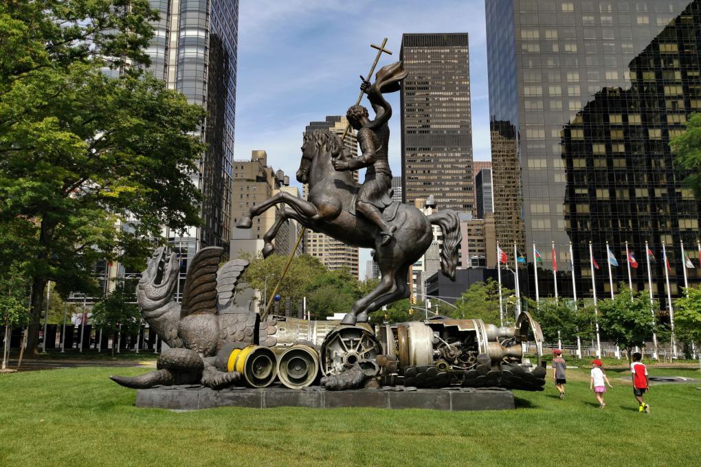 这是2019年8月5日在位于纽约的联合国总部拍摄的“善战胜恶”雕塑。这尊雕塑是苏联1990年为纪念《中导条约》签署和联合国成立45周年特地赠送给联合国的,由销毁的苏联和美国导弹零件铸成,刻画了代表正义的英雄杀死恶龙的场景。新华社记者李木子摄