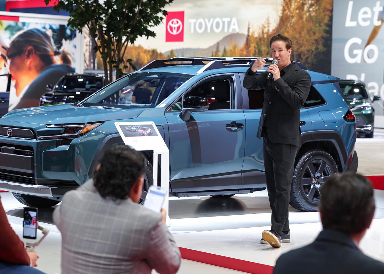 2月6日,在美国芝加哥麦考密克展览中心,一名发言人在丰田汽车展台介绍产品。新华社发(乔尔·莱纳摄)