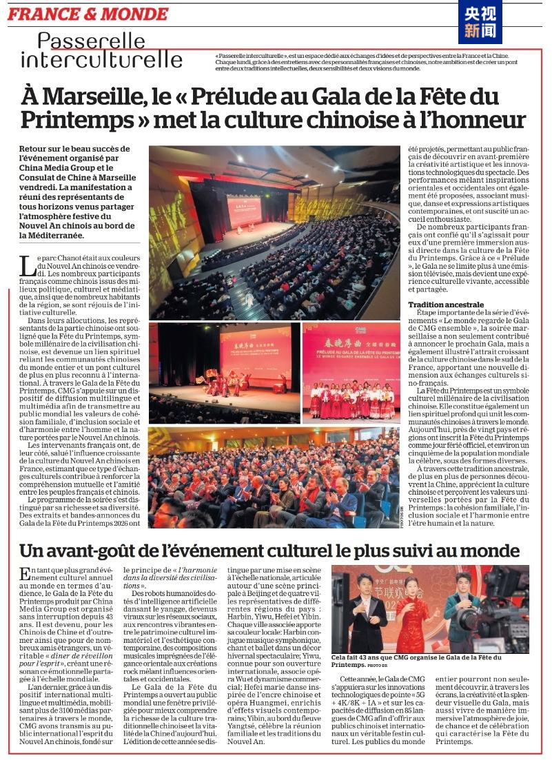 当天的活动吸引了法国南部各大区、各界人士的广泛关注。法国南部最具影响力的报纸之一《马赛人报》以整版篇幅报道总台“春晚序曲 全球看春晚”法国专场活动,称这是该地区首次以沉浸式体验近距离感受春节文化与春晚喜庆氛围。通过此次活动,春晚从荧屏节目转化为可感、可参与、可共享的年度文化盛事。