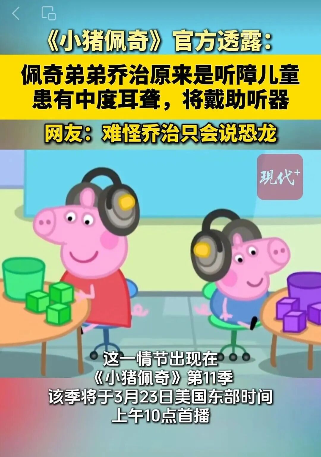 近日,孩之宝宣布,在广受欢迎的儿童动画《小猪佩奇》即将播出的新一季中,佩奇的弟弟乔治被诊断为中度听力障碍。