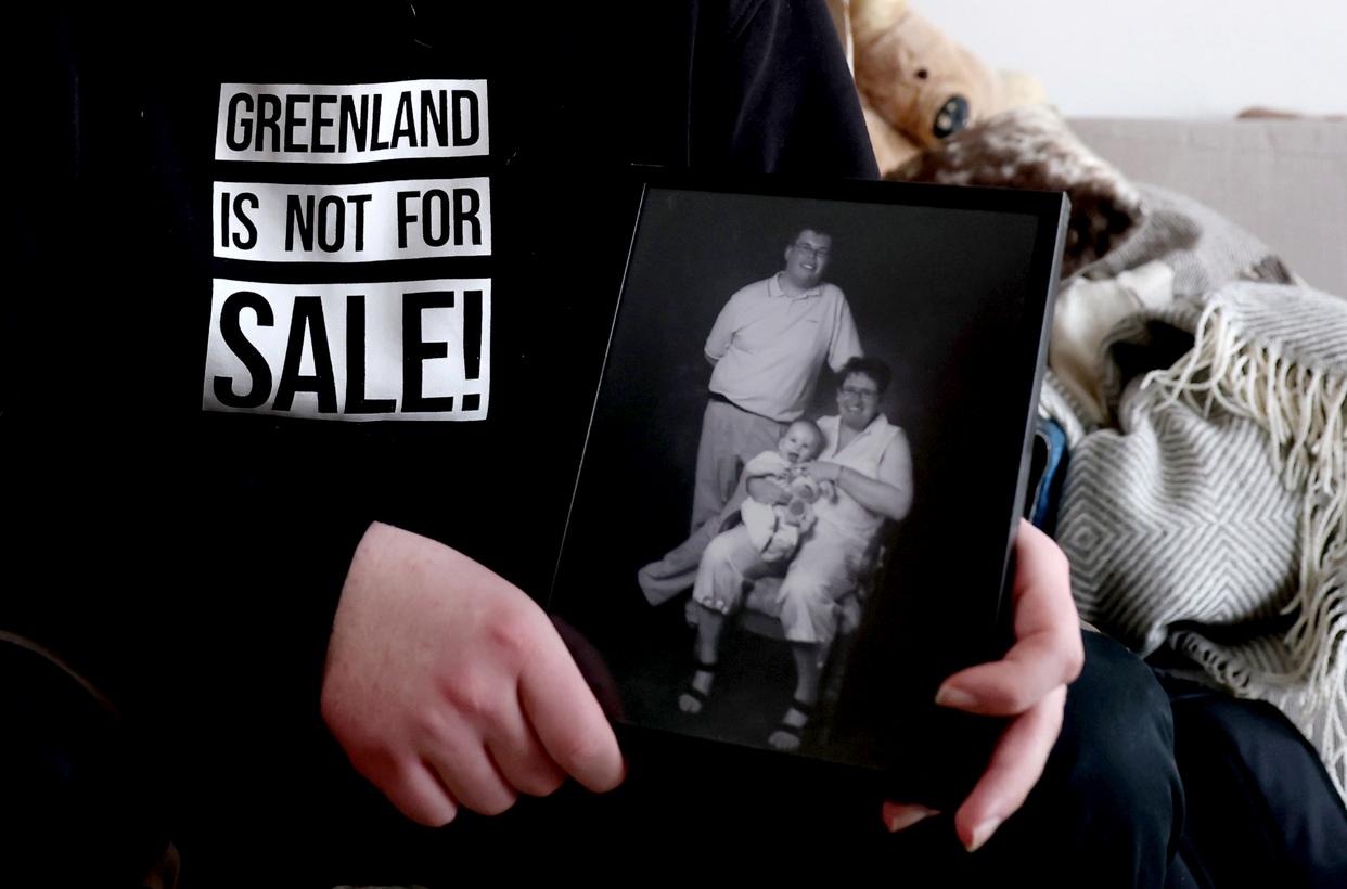 2月7日,在丹麦自治领地格陵兰岛首府努克,马利克穿着“格陵兰岛不出售”的卫衣在家中展示家庭合影。新华社记者 李颖 摄