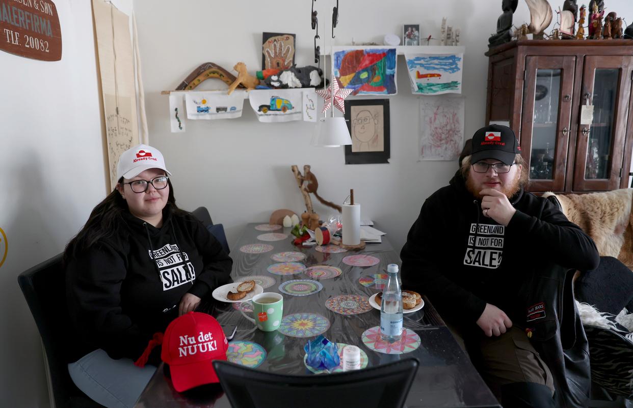 2月7日,在丹麦自治领地格陵兰岛首府努克,马利克·谢贝尔和女友穿着“格陵兰岛不出售”的卫衣在家中吃早餐。新华社记者 李颖 摄