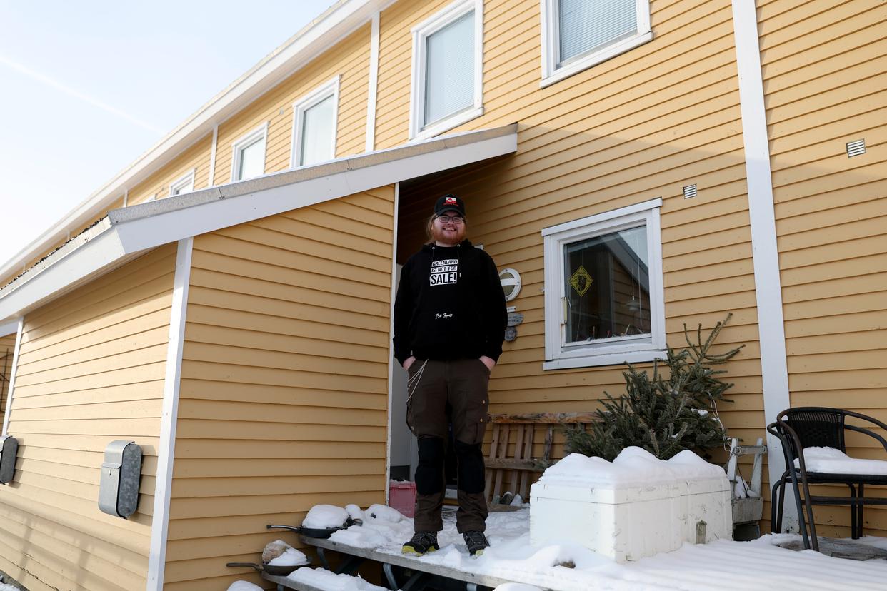 2月7日,在丹麦自治领地格陵兰岛首府努克,马利克·谢贝尔穿着“格陵兰岛不出售”的卫衣站在家门口。新华社记者 李颖 摄