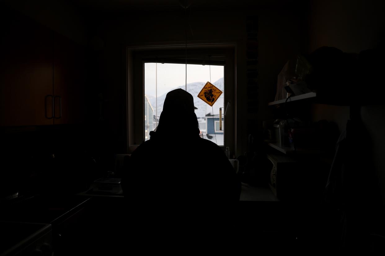 2月7日,在丹麦自治领地格陵兰岛首府努克,马利克·谢贝尔的女友透过窗户望向远处的雪山。新华社记者 李颖 摄