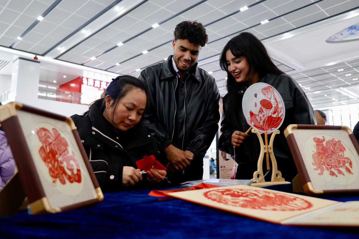 2026年2月2日,外国游客在江西景德镇北站候车室体验剪纸。新华社发(陆佳骏摄)