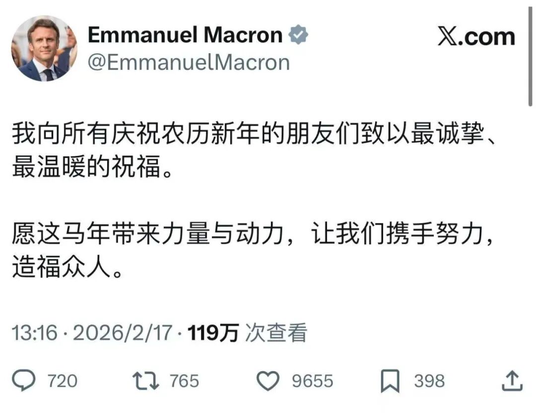 2月17日,中国农历马年大年初一,法国总统马克龙在社交媒体上用中文发文拜年。