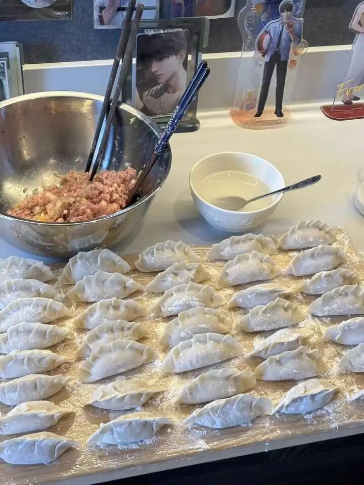我们自己调馅,然后自己包。当天的话,因为我们还是有课的,所以就是早上把课上完,然后中午马上赶回来准备。