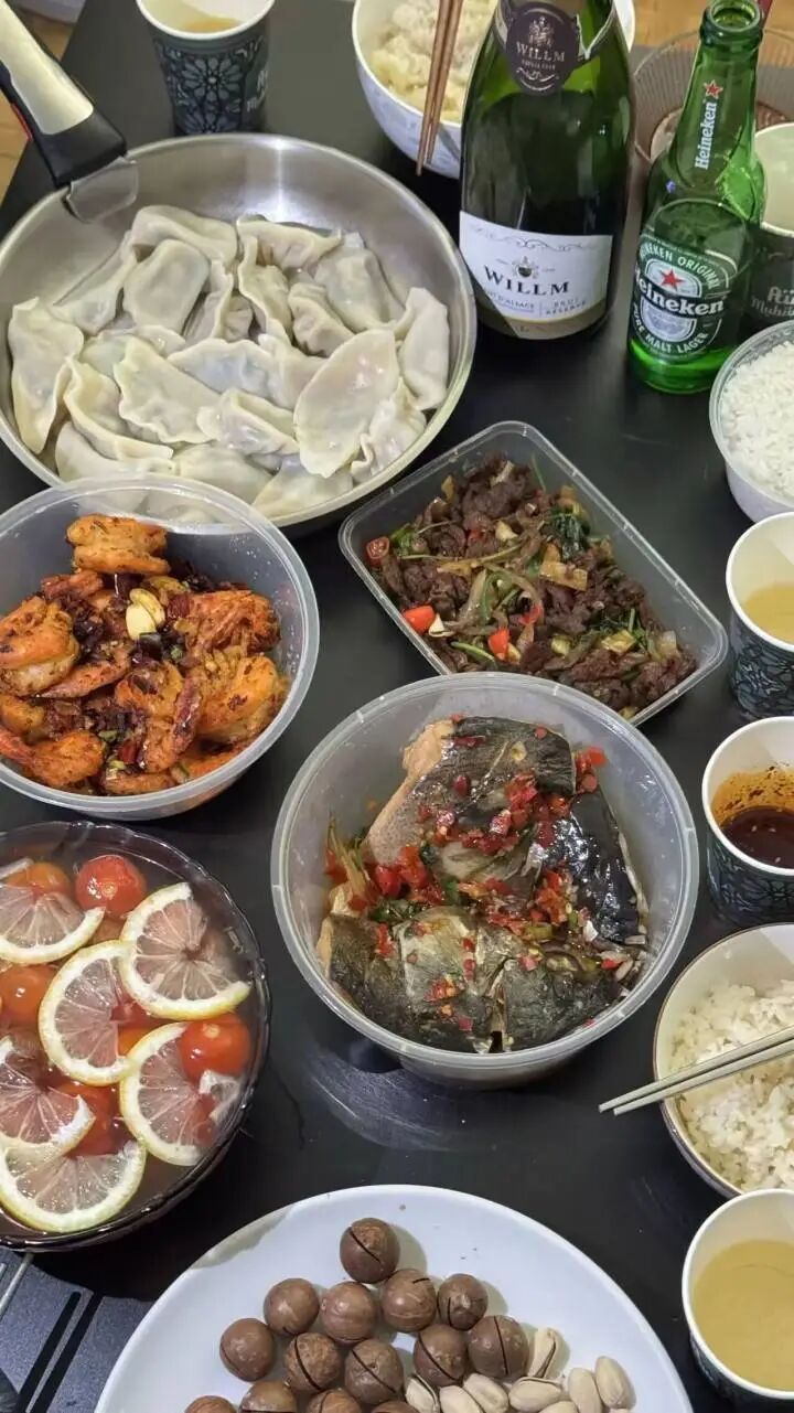 “今天我们下午有课,但晚上没课。下午下课之后,我和朋友三个人选择在当地唐人街的一家川菜馆吃年夜饭。一共花了200澳元,点的菜和主食有蛋炒饭、饺子、咸蛋黄炒南瓜、口水鸡、烤鱼、黑胡椒牛肉粒炒土豆、椒盐羊排。