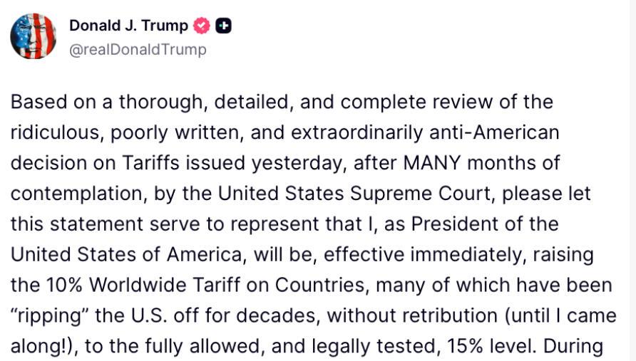 特朗普在文中称,“基于对美国联邦最高法院20日就关税问题作出的裁决进行全面、详尽且完整的审查——该裁决荒谬、措辞拙劣且极端反美”,“将自即日起,把目前对全球各国征收的10%统一关税,提高至完全被允许、并经过法律检验的15%水平。”