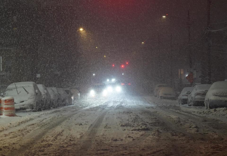 2月22日,在美国纽约,车辆在雪中缓慢行驶。新华社记者张凤国摄