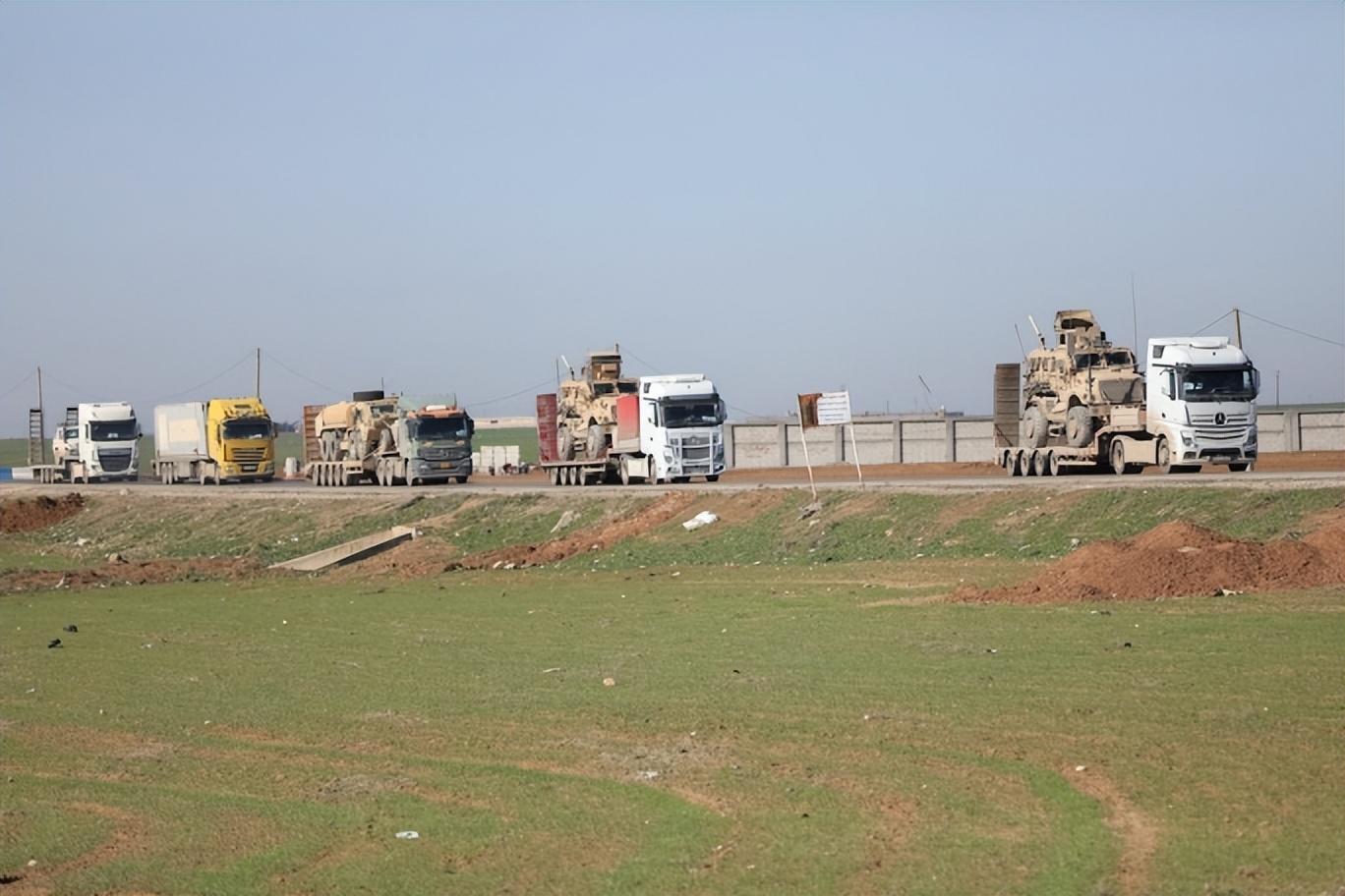当地时间2月23日,多辆载有美军车辆的卡车从叙利亚卡斯拉克军事基地撤离。 图源:外媒报道配图