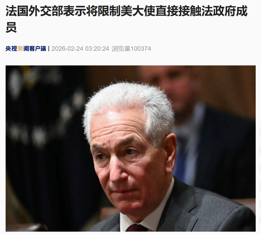 当地时间2月23日,因被法国外交部召见的美国驻法大使查尔斯·库什纳未亲自到场,法国外交部对此表示遗憾,并表示法国外长巴罗已要求其今后不得再直接接触法国政府成员。