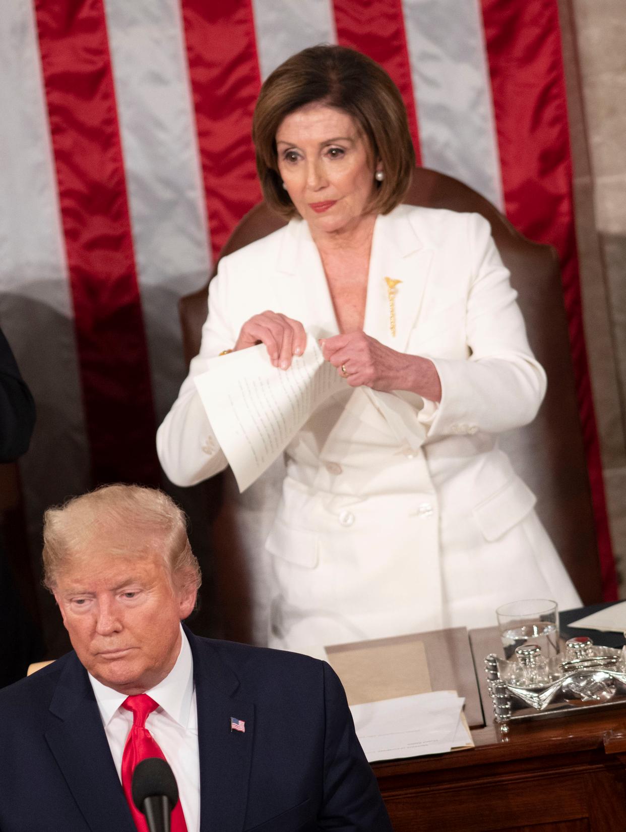 2020年2月4日,在美国首都华盛顿,特朗普(前)在国会发表国情咨文演讲后,佩洛西将讲稿副本撕毁。新华社记者刘杰摄 2020年2月,特朗普在首个任期内发表国情咨文时,时任众议院议长的佩洛西在他讲话结束后立即当众撕毁手中的特朗普讲稿副本。