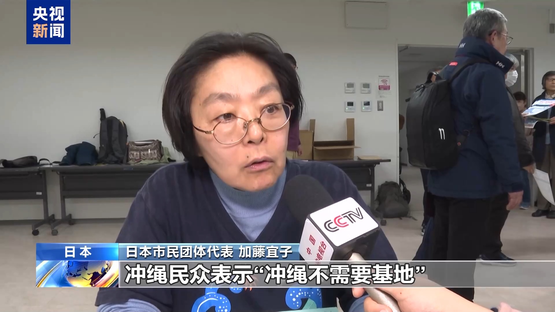 日本市民团体代表 加藤宜子:冲绳民众表示“冲绳不需要基地”,再加上这是对自然环境的严重破坏,这些问题都很突出,我们还是希望建设一个没有战争的社会。