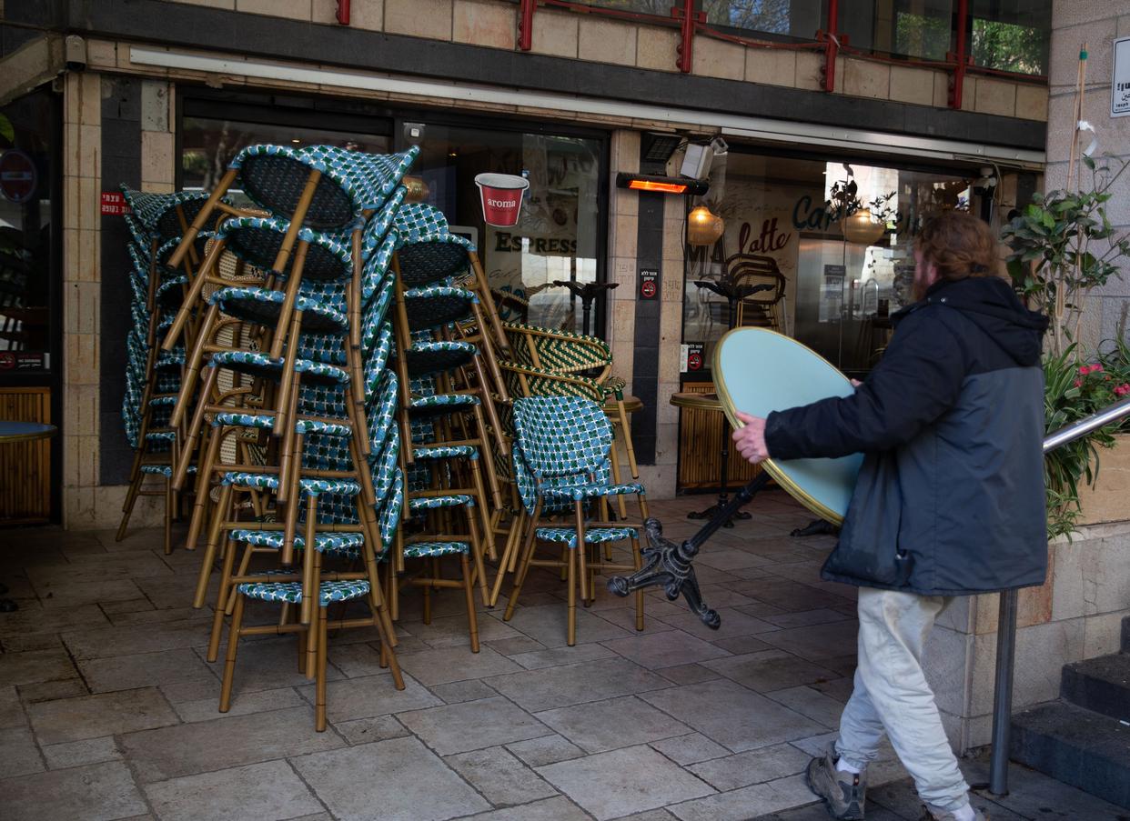 2月28日,在耶路撒冷,一处咖啡馆在防空预警响起后关闭。新华社记者 陈君清 摄