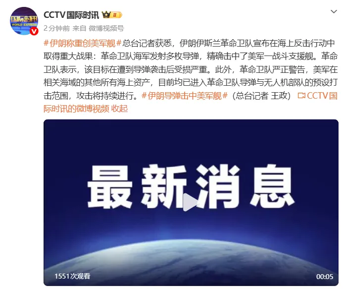 总台记者获悉,伊朗伊斯兰革命卫队宣布在海上反击行动中取得重大战果:革命卫队海军发射多枚导弹,精确击中了美军一战斗支援舰。革命卫队表示,该目标在遭到导弹袭击后受损严重。此外,革命卫队严正警告,美军在相关海域的其他所有海上资产,目前均已进入革命卫队导弹与无人机部队的预设打击范围,攻击将持续进行。