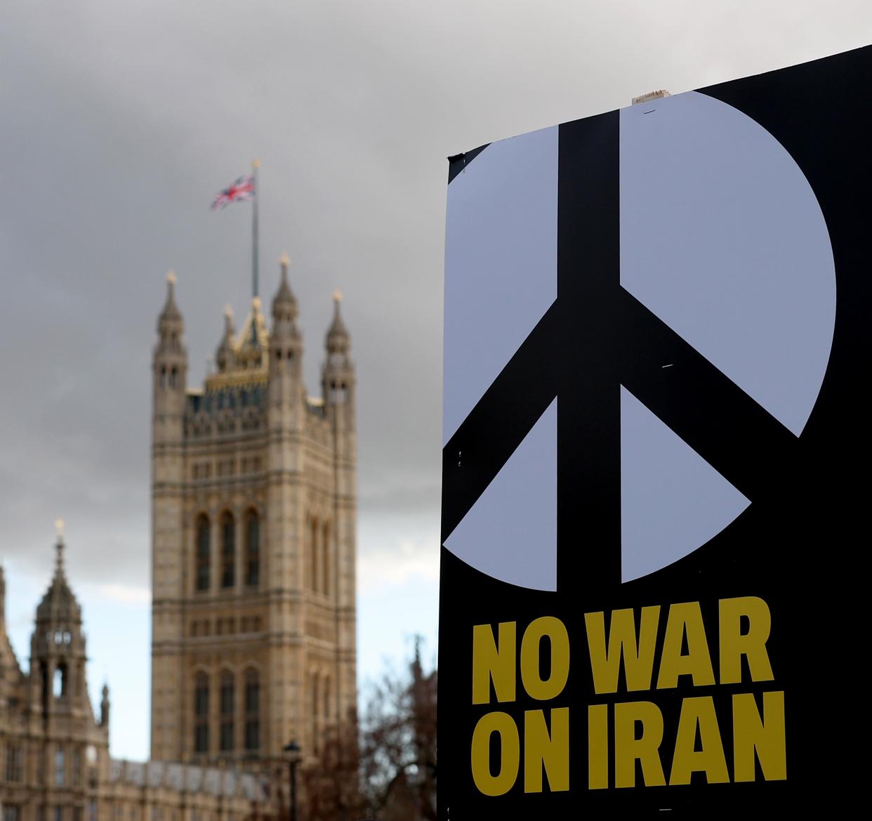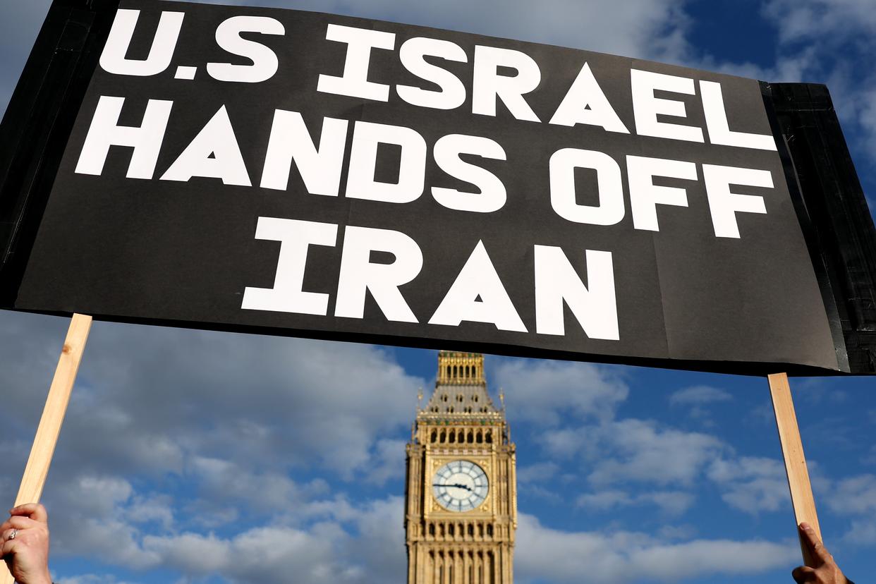 2月28日,民众在英国伦敦议会广场举行示威,抗议美国和以色列军事打击伊朗。新华社记者 李颖 摄