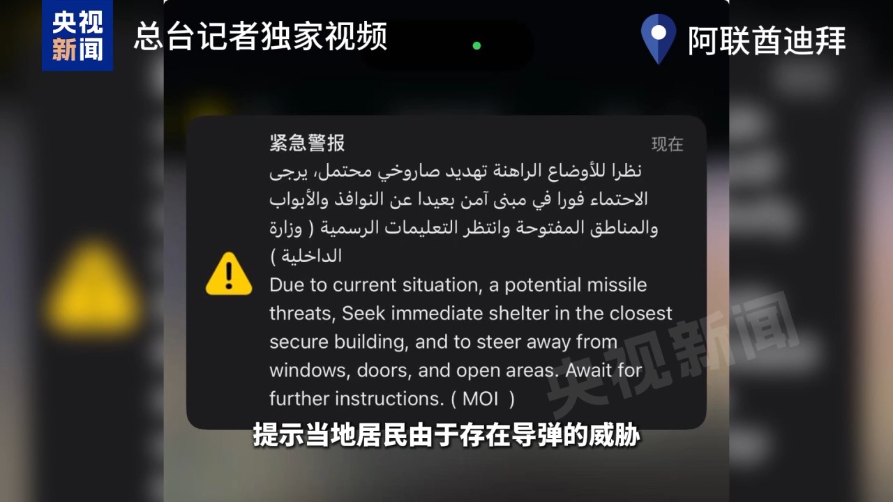 总台记者 王寅:阿联酋内政部门进行了多次安全警报的推送,提示当地居民由于存在导弹的威胁,呼吁大家立即前往安全建筑物内进行避险,同时远离门窗以及空旷的地带。在同一时间,阿联酋首都阿布扎比也传出了多轮爆炸声,当地居民也接到了同样的安全警报推送。