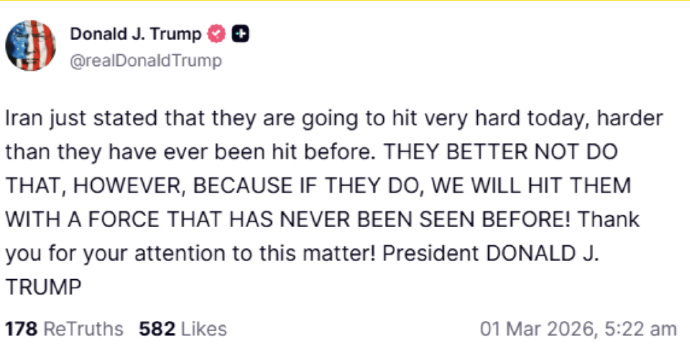 另据环球时报,卡塔尔半岛电视台3月1日报道,美国国防部长赫格塞斯扬言 “将摧毁伊朗海军”,并称美军已 “全面放开行动限制”,以实现特朗普设定的目标。