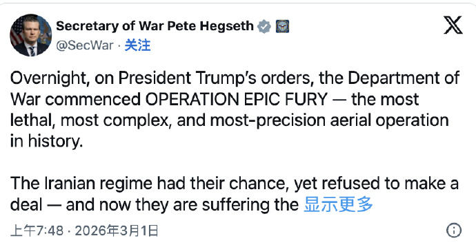 赫格塞斯在社交平台X发文称,在美国与以色列联合发动袭击后,伊朗发起反击行动,美方 “绝不会容忍针对美国人的强力导弹”。