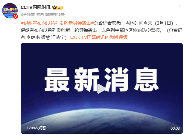 总台记者获悉,当地时间今天(3月1日),伊朗宣布向以色列发射新一轮导弹袭击,以色列中部地区拉响防空警报。(总台记者 李健南 梁慧 江浩宇)