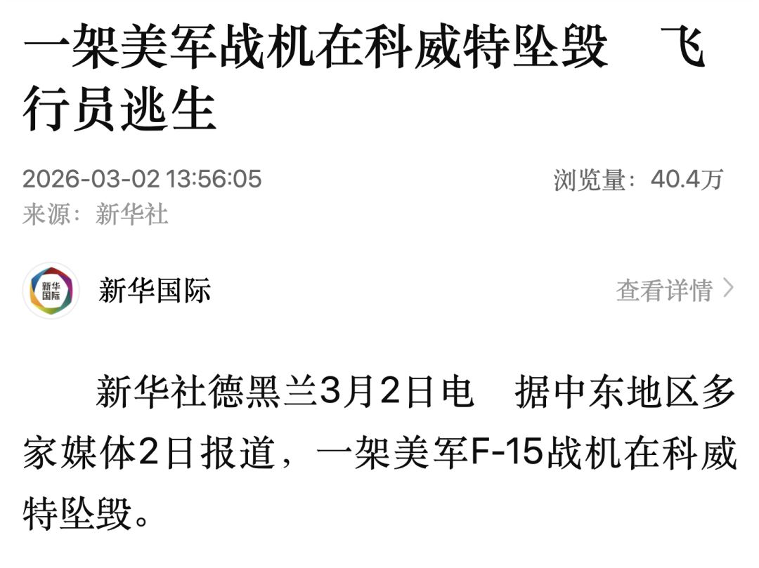 据新华社援引中东地区多家媒体3月2日报道,一架美军F-15战机在科威特坠毁。
