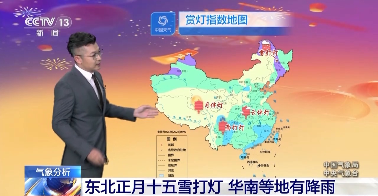 中国气象局气象分析师:今天是元宵佳节,是大家户外赏灯赏月的黄金时段。从天气条件来看,在北方,一个蒙古气旋逐渐东移,我们国家东北地区降雪较为频繁。而在南方,冷空气南下,冷暖空气交汇,在华南等地阴雨天气也相对较多。今天晚些时候,辽宁的东部、吉林、黑龙江等地将会有小到中雪;而在南方,广东沿海、广西沿海、海南以及台湾等地将会有小到中雨天气。