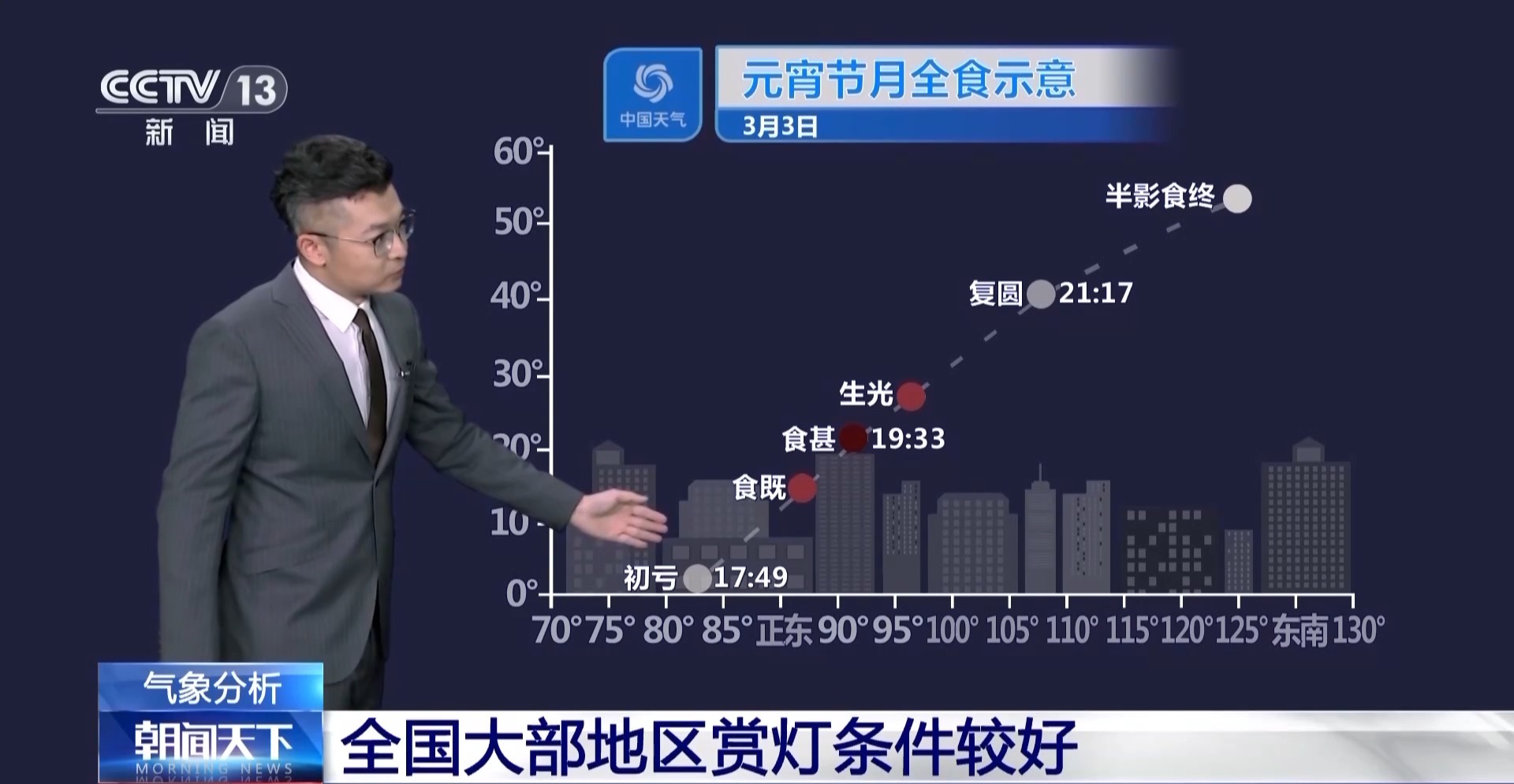 就赏灯的气象条件来看,中东部大部地区大多是云伴灯,整体有利于户外赏灯。而就赏月的天气条件来看,今天明月,同时还会出现月全食。中东部很多地区都会是带食月出。以华东地区为例,大致初亏的时间是17:49,而食甚的时间是19:33。由于整体的地平高度角相对较低,所以这一次的元宵节月全食还是非常有利于我们拍摄的。