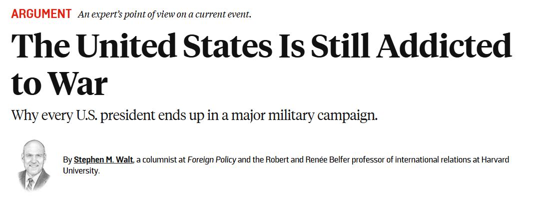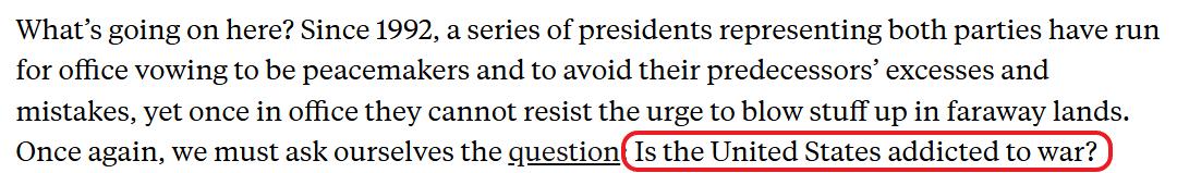 作者质疑,美国早已明白,频繁发动战争很少能根本性解决政治问题,也无法让美国更安全,更不会对受到干涉的国家有利。为什么华盛顿仍然一再这样做?美国是否已经对战争上瘾?