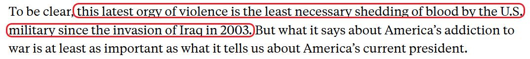 文章最后指出,当前对伊朗的军事行动,是自2003年伊拉克战争以来“最没有必要的一次流血冲突”。但它所揭示的是美国对战争的沉迷,这值得反思。