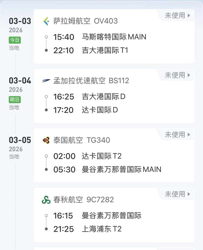 但最怕突如其来的变故。3月2日,邓野收到通知,飞往孟买的航班不知为何被取消,她不得不重新规划路线。最终,她又购买了3月3日由阿曼飞往印度达卡的航班。