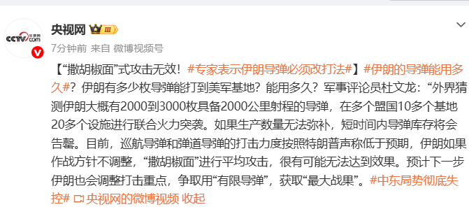 军事评论员杜文龙:“外界猜测伊朗大概有2000到3000枚具备2000公里射程的导弹,在多个盟国10多个基地20多个设施进行联合火力突袭。如果生产数量无法弥补,短时间内导弹库存将会告罄。