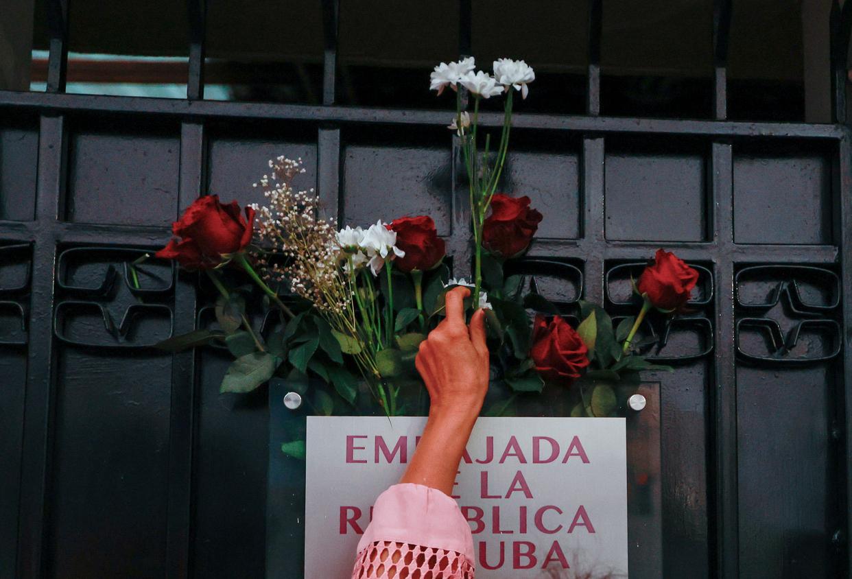 3月4日,在厄瓜多尔首都基多,抗议者在古巴驻厄瓜多尔大使馆门口摆放鲜花。新华社发(里卡多·兰德塔摄)