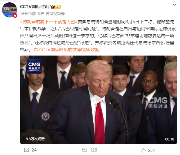 美国总统特朗普当地时间3月5日下午称,他希望先结束伊朗战争,之后“古巴只是时间问题”。特朗普是在白宫与迈阿密国际足球俱乐部共同出席一场活动时作出这一表态的。他称古巴方面“非常迫切地想要达成一项协议”,还称委内瑞拉局势已经“稳定”,并称赞委内瑞拉现任代总统德尔西·罗德里格斯。