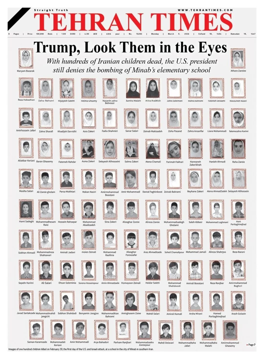 伊朗《德黑兰时报》3月9日在头版刊发题为《特朗普,请注视他们的眼睛》的文章,配图为伊朗南部米纳卜市一所小学受害儿童的遗照,谴责美国和以色列对伊朗发动联合军事打击所造成的人道主义灾难。