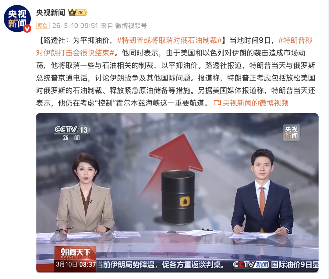 当地时间9日,特朗普称对伊朗打击会很快结束。他同时表示,由于美国和以色列对伊朗的袭击造成市场动荡,他将取消一些与石油相关的制裁,以平抑油价。