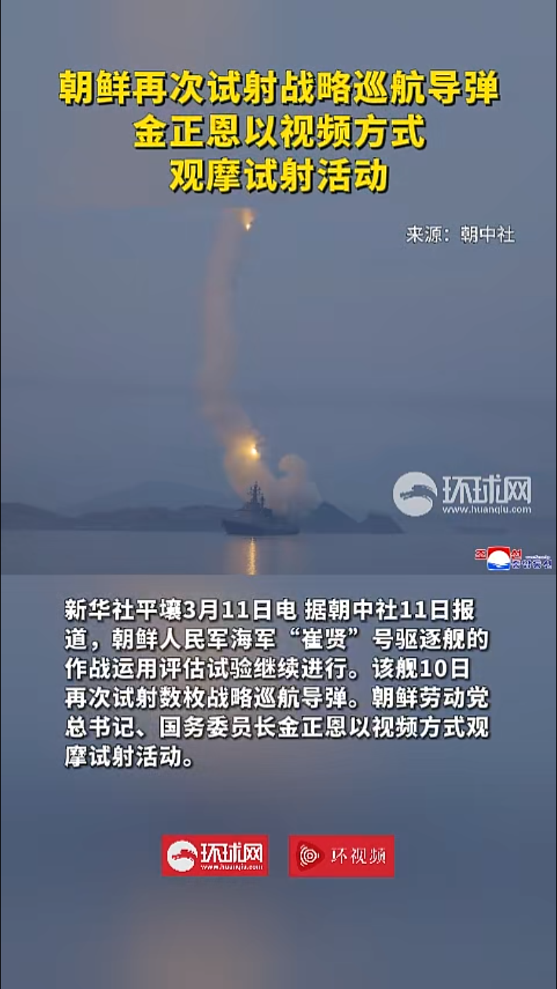 朝鲜再次试射战略巡航导弹,金正恩以视频方式观摩试射活动