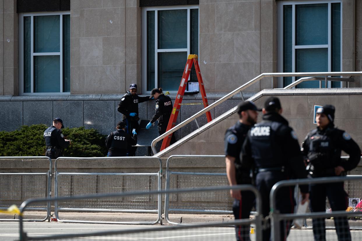 3月10日,警察在加拿大多伦多的美国驻多伦多总领馆外对弹着点进行拍照取证。新华社发(李海涛摄)