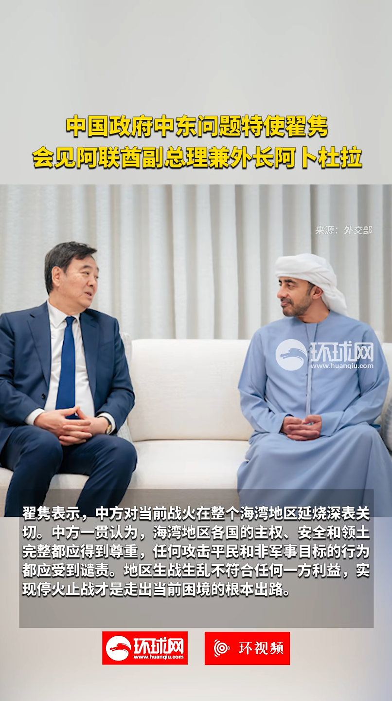 2026年3月10日,中国政府中东问题特使翟隽访问阿联酋,会见阿联酋副总理兼外长阿卜杜拉。