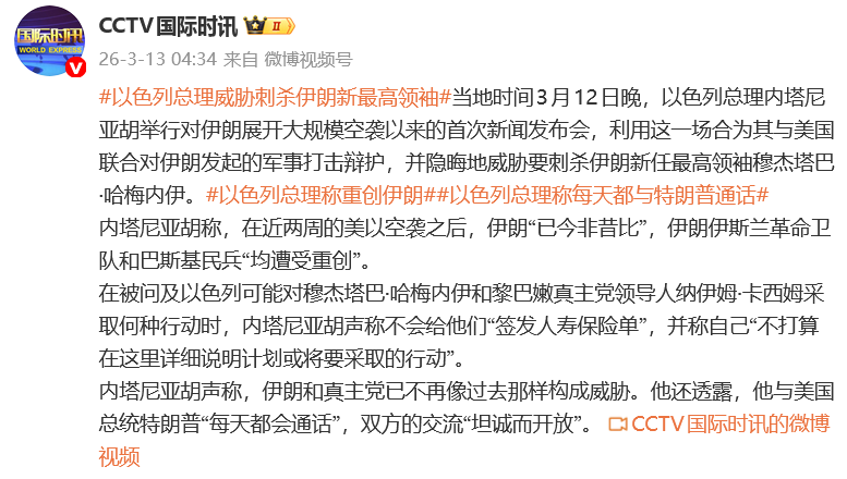 当地时间3月12日晚,以色列总理内塔尼亚胡举行对伊朗展开大规模空袭以来的首次新闻发布会,利用这一场合为其与美国联合对伊朗发起的军事打击辩护,并隐晦地威胁要刺杀伊朗新任最高领袖穆杰塔巴·哈梅内伊。