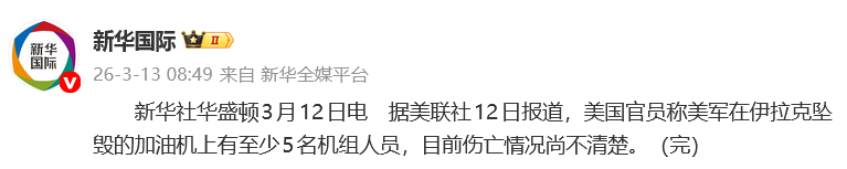 刚刚,@新华国际:据美联社12日报道,美国官员称美军在伊拉克坠毁的加油机上有至少5名机组人员,目前伤亡情况尚不清楚。