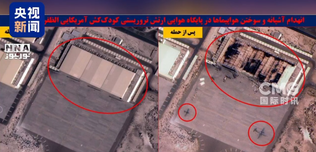 △伊朗12日晚公布其对美军在中东多处基地进行袭击前后卫星图像对比