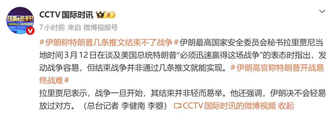 伊朗最高国家安全委员会秘书拉里贾尼当地时间3月12日在谈及美国总统特朗普“必须迅速赢得这场战争”的表态时指出,发动战争容易,但结束战争并非通过几条推文就能实现。