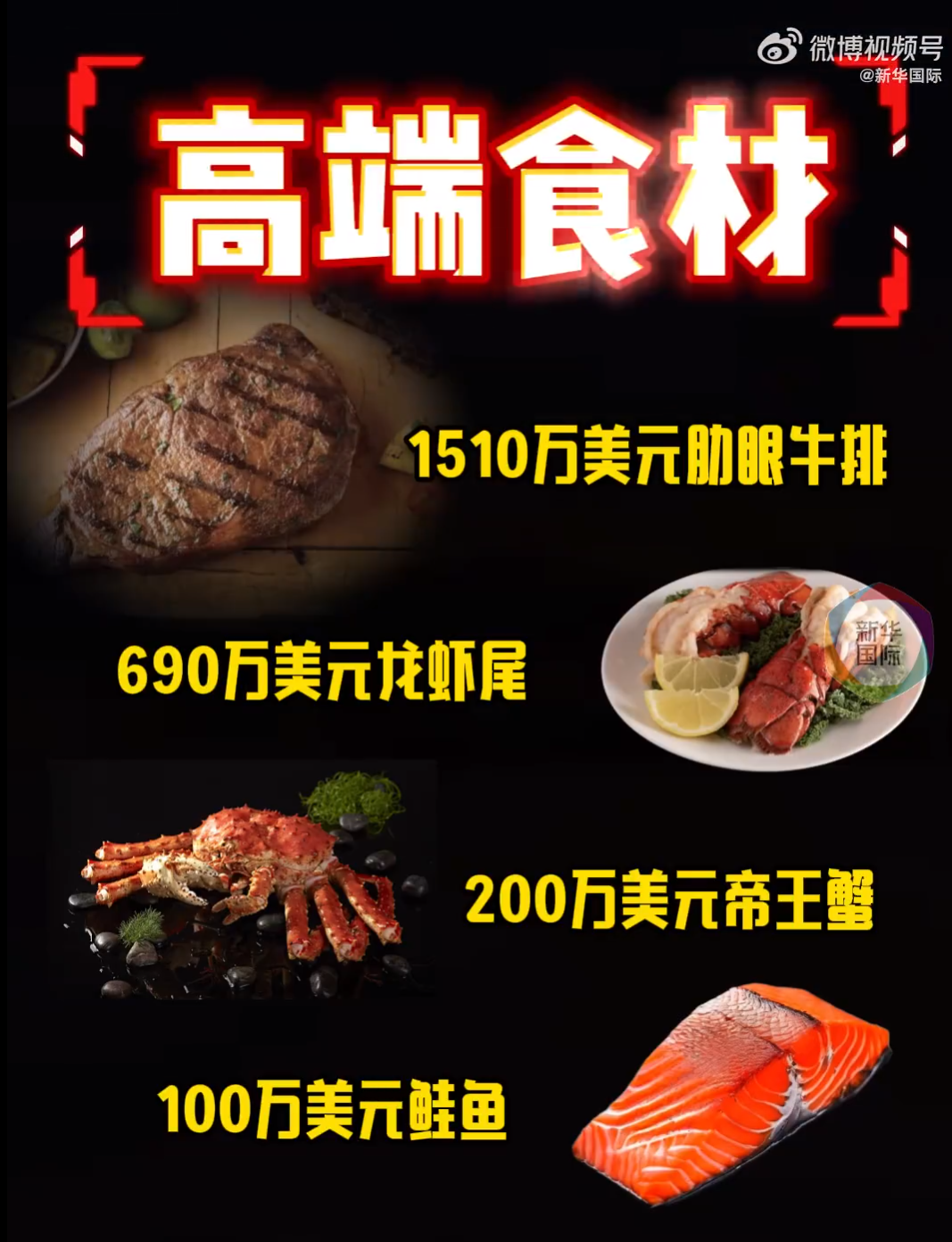 那么,这些钱都花哪儿去了?——高端食材:1510万美元的肋眼牛排、690万美元的龙虾尾、200万美元的帝王蟹,还有100万美元的鲑鱼。